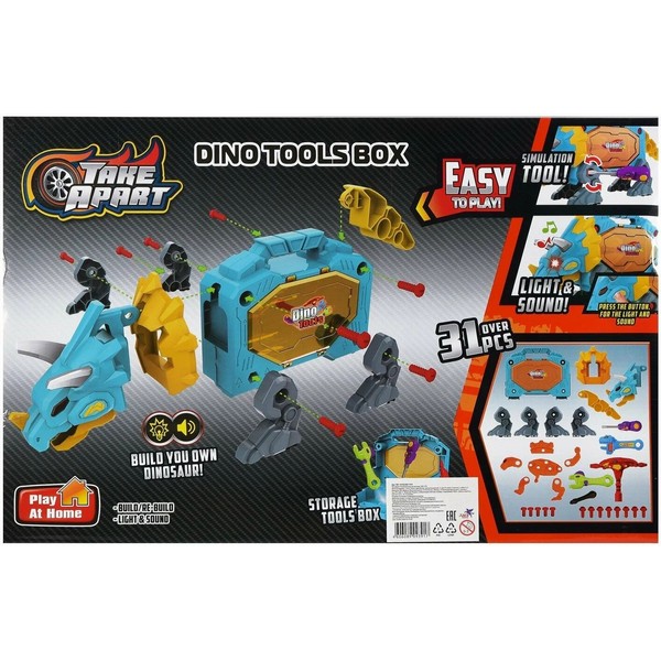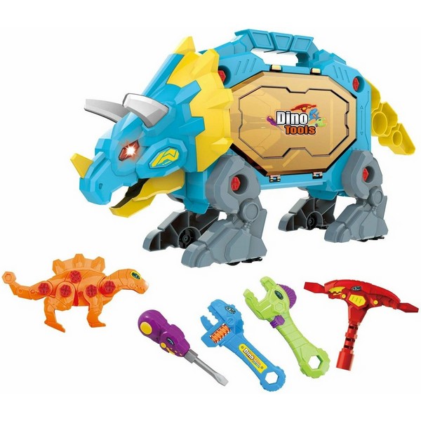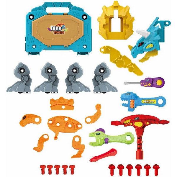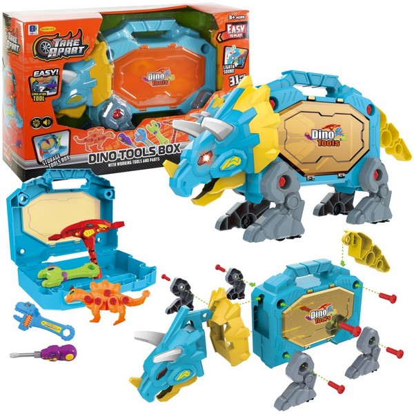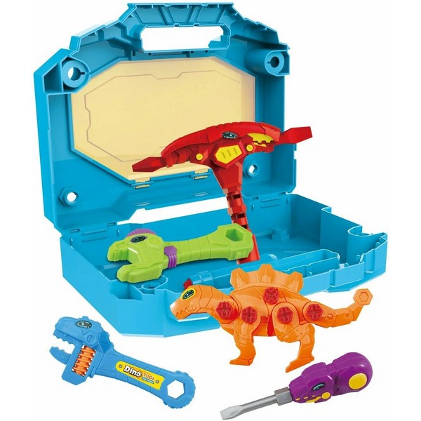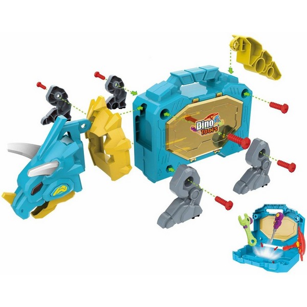 Чемоданчик путем присоединения нескольких деталей трансформируется в большого динозавра: собирается голова, прикручиваются лапы и хвост. На корпусе чемоданчика есть удобный отсек для хранения деталей и инструментов. Инструменты, входящие в состав набора, имеют оригинальную форму, они похожи на динозавриков. С их помощью можно собрать фигурку еще одного динозаврика.